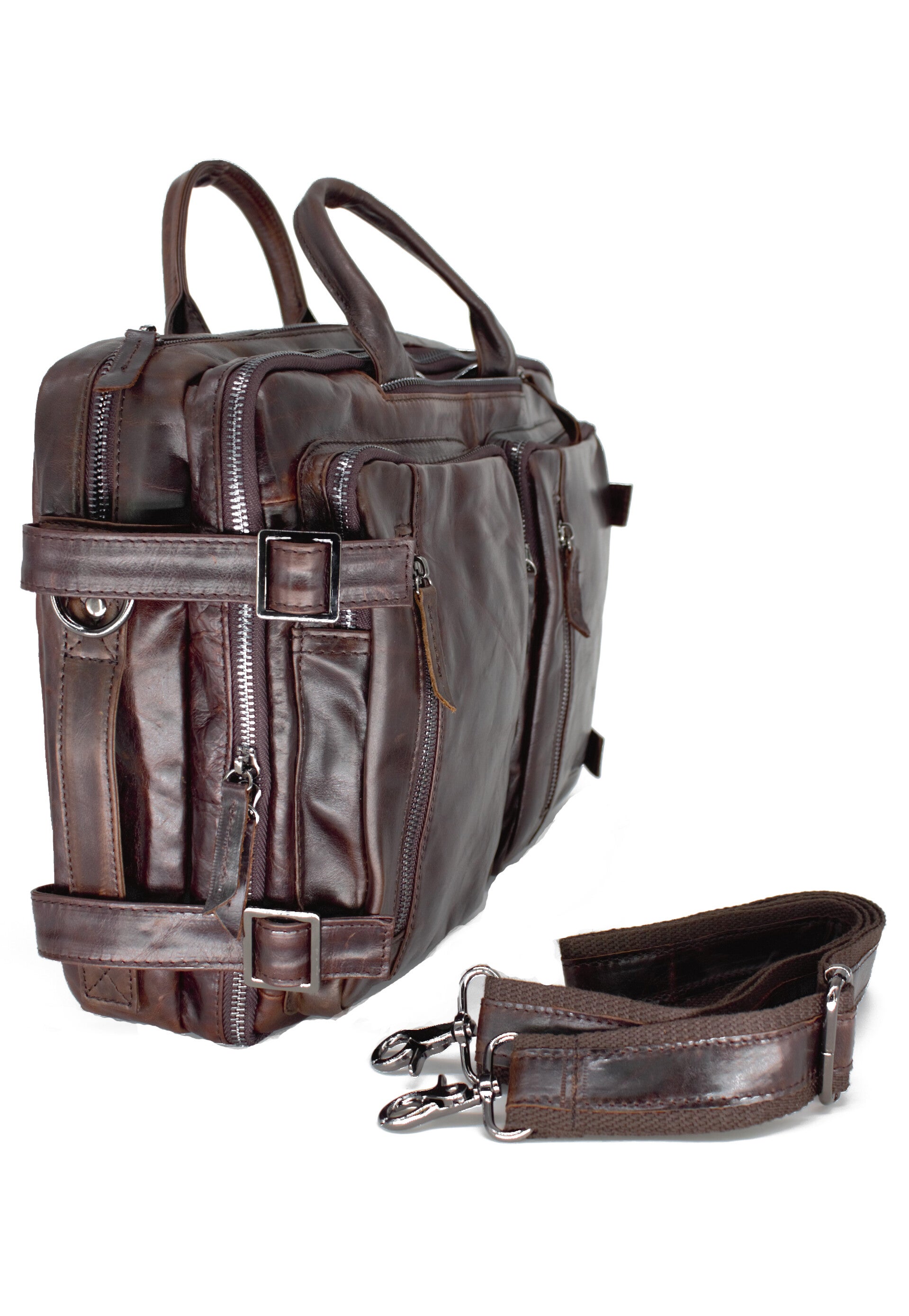 Transformers zijn onze multifunctionele leren tassen die als toverslag van vorm veranderen. Het ene moment zijn ze rugzak, en het volgende moment zijn het stevige handtassen die geschikt zijn als laptoptas, aktetas of handtas, zowel voor dagelijks als zakelijk gebruik. En door de meegeleverde optionele en verstelbare schouderband zijn de Transformers ook comfortabel over de schouder te dragen. De rugbanden zijn in speciale ritsvak op te bergen. Transformers zijn van hoogwaardig rundleer gemaakt en krijgen gedurende het gebruik meer karakter (patina) en worden steeds mooier.